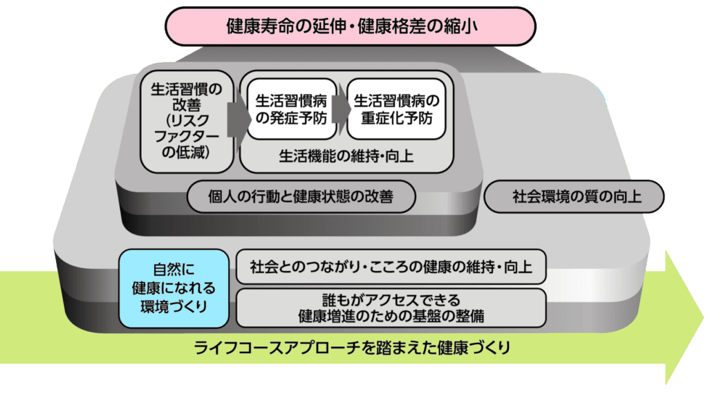 「健康日本21(第三次)」の厚生労働省の検討案の中に、この表現が新たに盛り込まれています。 国土交通省、経済産業省、スポーツ庁などの省庁が担当している環境を健康づくりに活かす動きもあります。