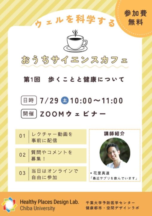 7/29(土)10:00-11:00 に、「ウェルを科学するおうちサイエンスカフェ~第1回 歩くことと健康について~」を開催します!