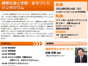 2016年6月14日(火) 14:00~より、東京霞ヶ関のイイノホールにて、千葉大学予防医学センターと株式会社竹中工務店との共同開催「健康社会と空間・まちづくり
