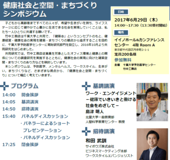 千葉大学予防医学センターでは竹中工務店と共同でシンポジウムを開催しております。本年度は基調講演に島津明人先生、招待講演にサイボウズ株式会社の和田武訓氏をお迎えし、「健康社会と空間・まちづくりシンポジウム」を開催いたしますのでご案内申し上げます。