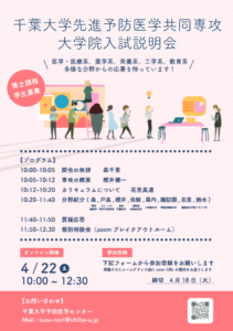 4月22日(土)に令和5年度10月入学および令和6年度4月入学希望者・検討者に対して、大学院の特徴や在籍教員の研究テーマを紹介する目的で、先進予防共同大学院説明会をオンラインにて開催します。参加をご希望の方は、下記の参加登録フォームより事前の登録をお願いします。
