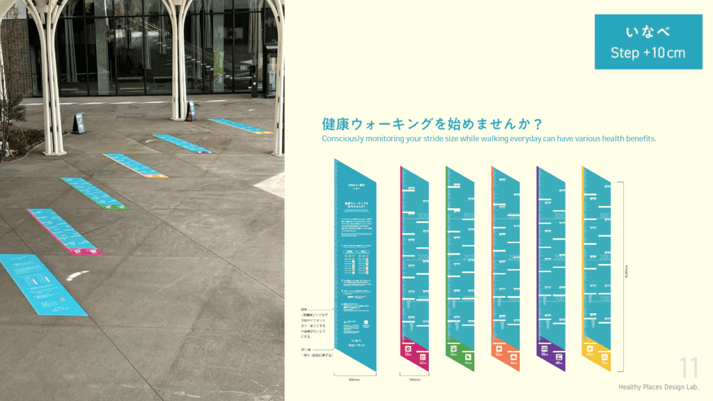 三重県いなべ市の市庁舎エントランスに、健康への気づきを得る空間デザインプログラム「いなべStep+10cm」を設置しました。このプロジェクトは、年代と身長から自分のいつもの(一般的な)歩幅を知り、歩くことができ、その後、プラス10cmのややおおまた歩きを試すことができるアートサインプロジェクトです。地元のケーブルテレビの下記動画6分55秒から11分03秒までに取材動画があります。