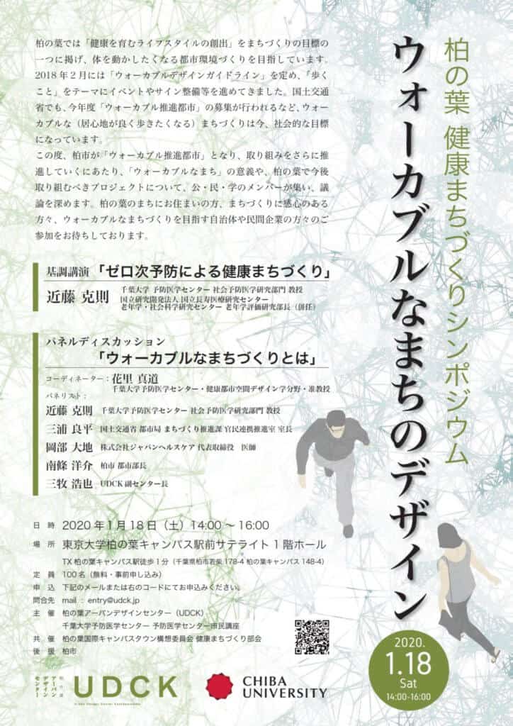 1月18日(土)に、柏の葉キャンパスタウンで、ウォーカブルなまちのデザインについてのシンポジウムを開催します。詳細・お申し込みはUDCKホームページにて。