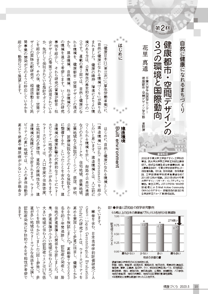 公益財団法人 健康・体力づくり事業財団が全国の自治体職員等に向けて発刊する月刊紙「健康づくり」で、令和5年の連載の企画を、近藤克則先生と担当しています。テーマは、「自然に健康になれる環境づくり」です。令和5年4月号は、近藤克則先生が執筆され、5月号を花里が「健康都市・空間デザインの3つの環境と国際動向」として担当しました。