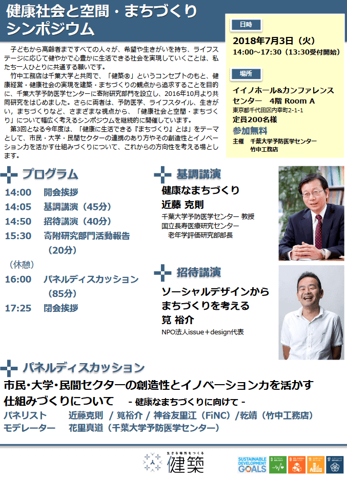 千葉大学予防医学センターでは竹中工務店と共同でシンポジウムを開催しております。本年度は基調講演にJAGESプロジェクトを率いる千葉大学予防医学センター近藤克則教授、招待講演にNPO法人issue+design代表の筧裕介氏をお迎えし、「健康社会と空間・まちづくりシンポジウム」を開催いたしますのでご案内申し上げます。