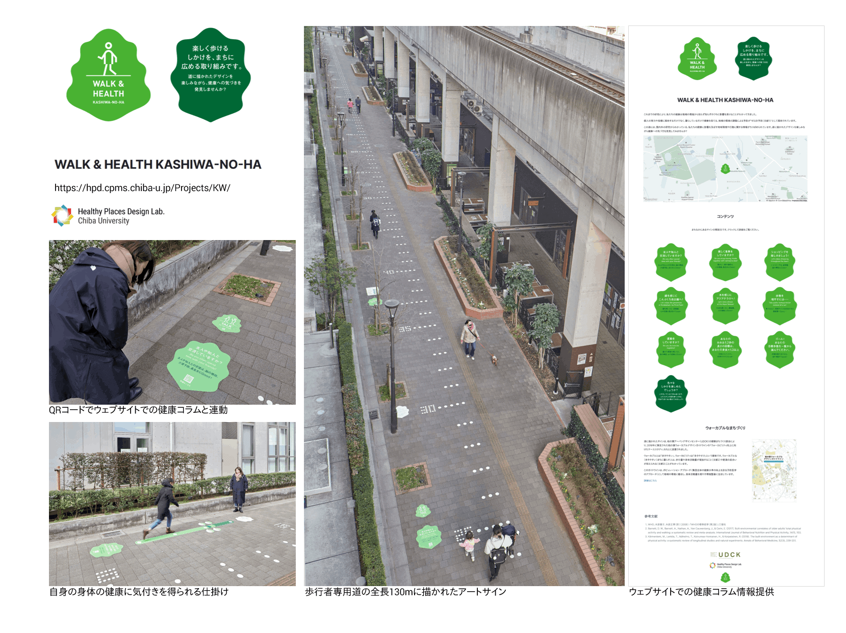 これまでの研究により、私たちの健康は地域の環境から知らず知らずのうちに影響を受けることがわかってきました。個人の努力や我慢に期待するだけでなく、暮らしているだけで健康を保てる、地域の環境の調整による予防が“ゼロ次予防”として期待されています。今回、千葉県柏市柏の葉キャンパス地域の歩行者専用道に、健康への気づきをアートサインとして設置しました。