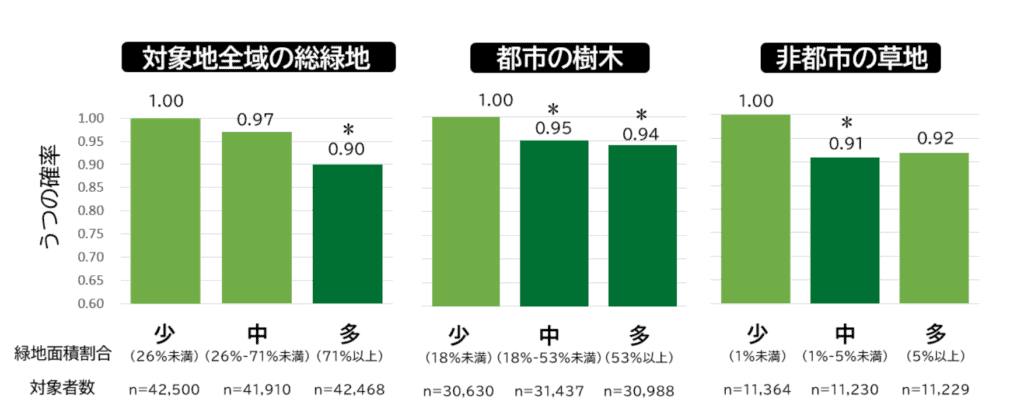 - 非都市において、草地が中程度の地域は、少ない地域に比べて高齢者のうつが約9%少ない